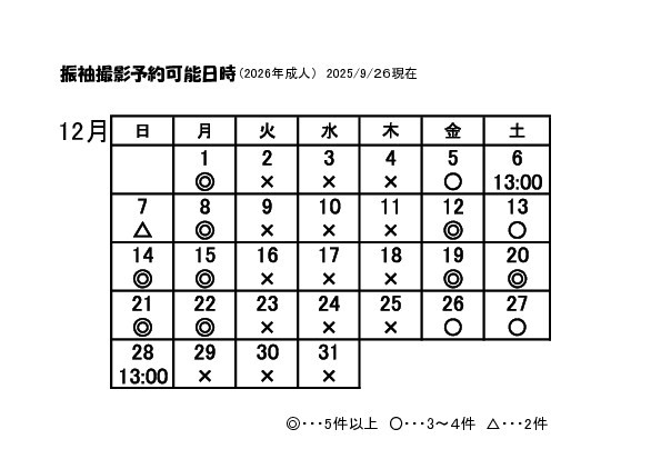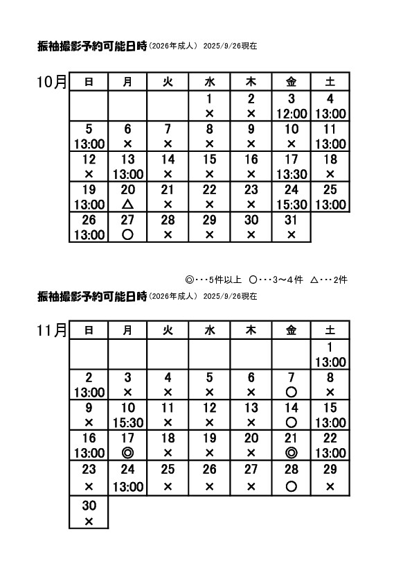 ※9月26日現在の空き状況になりますので、お問合せの際はすでにご予約がうまってしまっている可能性がございます。